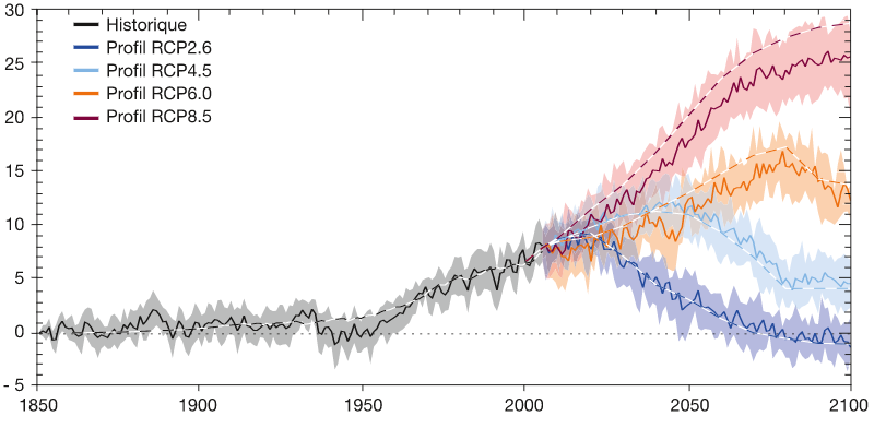 En dépit de ces avancées, la quantification des trajectoires climatiques au cours du XXIème siècle repose sur des démarches complexes: comment traiter à la fois les incertitudes liées aux émissions (voir ci contre), la divergence des modèles climatiques (globaux et régionaux), les biais des modèles, les tendances climatiques et la variabilité climatique?
